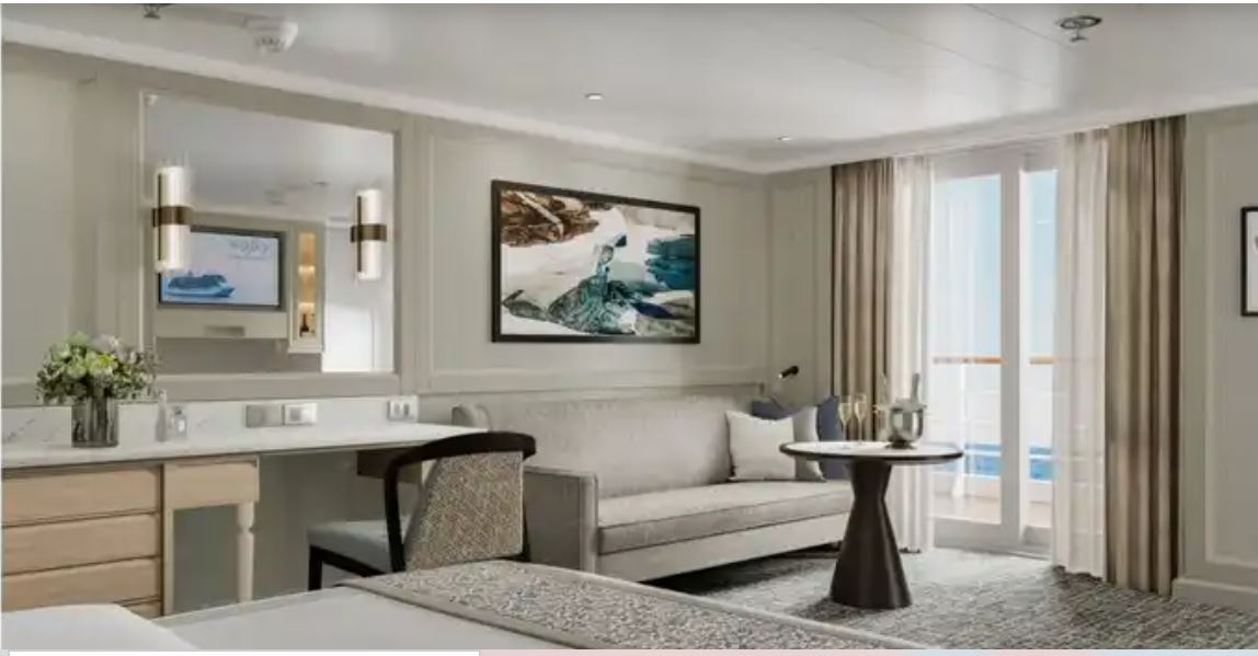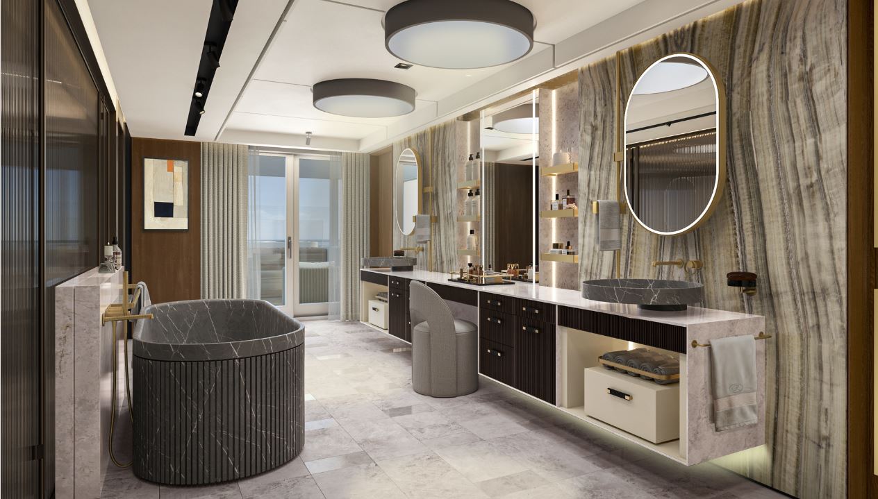 The suites have all grown in size and there are new two-story suites. The Sky View suite is something we’re really proud of; it’s larger than anything we’ve ever designed at sea, literally three times the size of my home. Covering 3,700 square feet of space over two levels, it has an interior lift and grand staircase and the second floor is a master suite with a gym and bathrooms and his and hers walk-in closets. The outdoor space is really impressive and expansive as well.