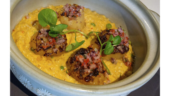 Cazuela de Arroz Nikkei – Miso-glazed scallops atop perfectly cooked bomba rice, finished with vibrant chalaquita for a balanced bite of citrus and heat.