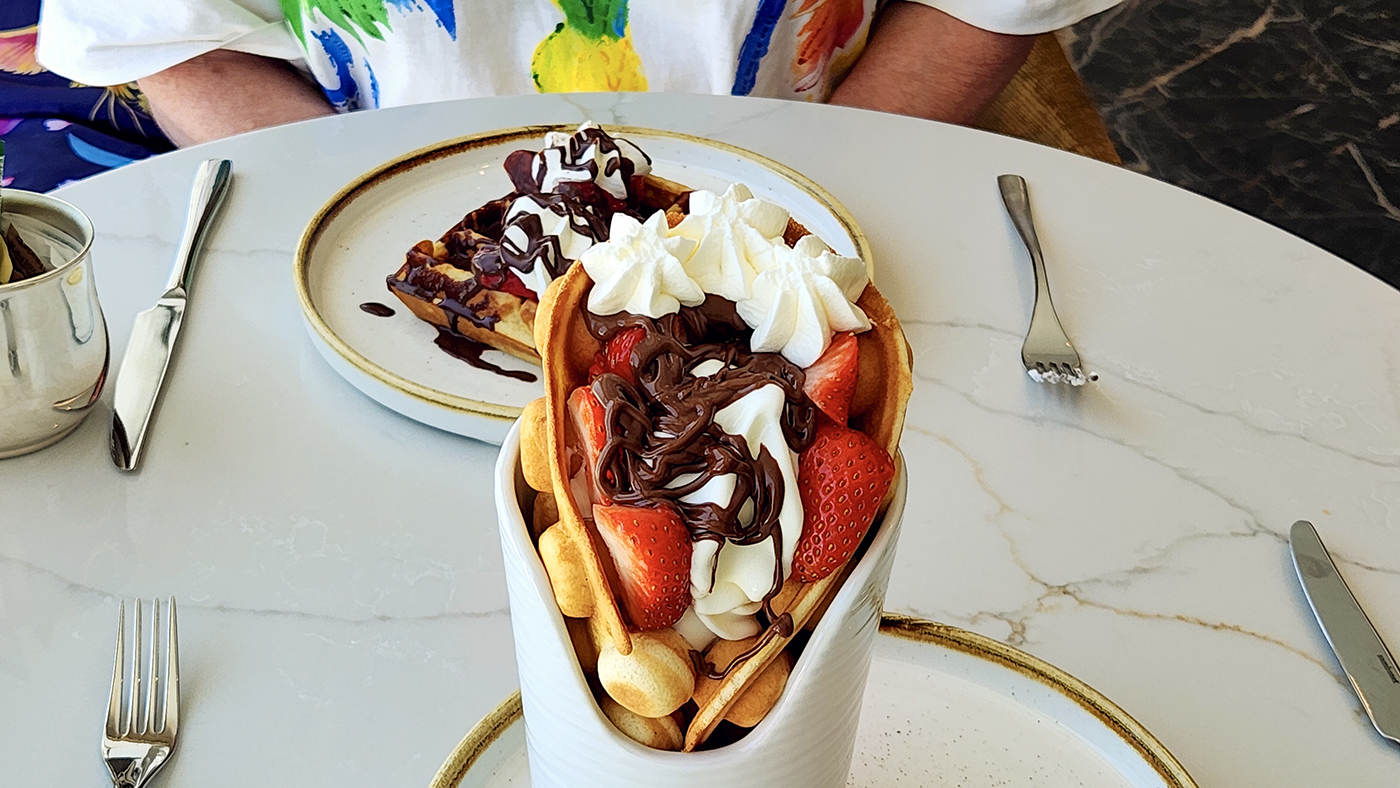 Most elaborate of all are the bubble wraps with a choice of eight flavors of soft-serve gelato, including pistachio and mango. You get a hefty swirl of the cream with the waffles or you can just enjoy it straight in a cone or cup. It’s strictly indulgence and frankly, it’s a little over the top because everything on the menu is so sweet you can feel an all-day sugar rush. For the future, can I suggest they add cheese and savory options?